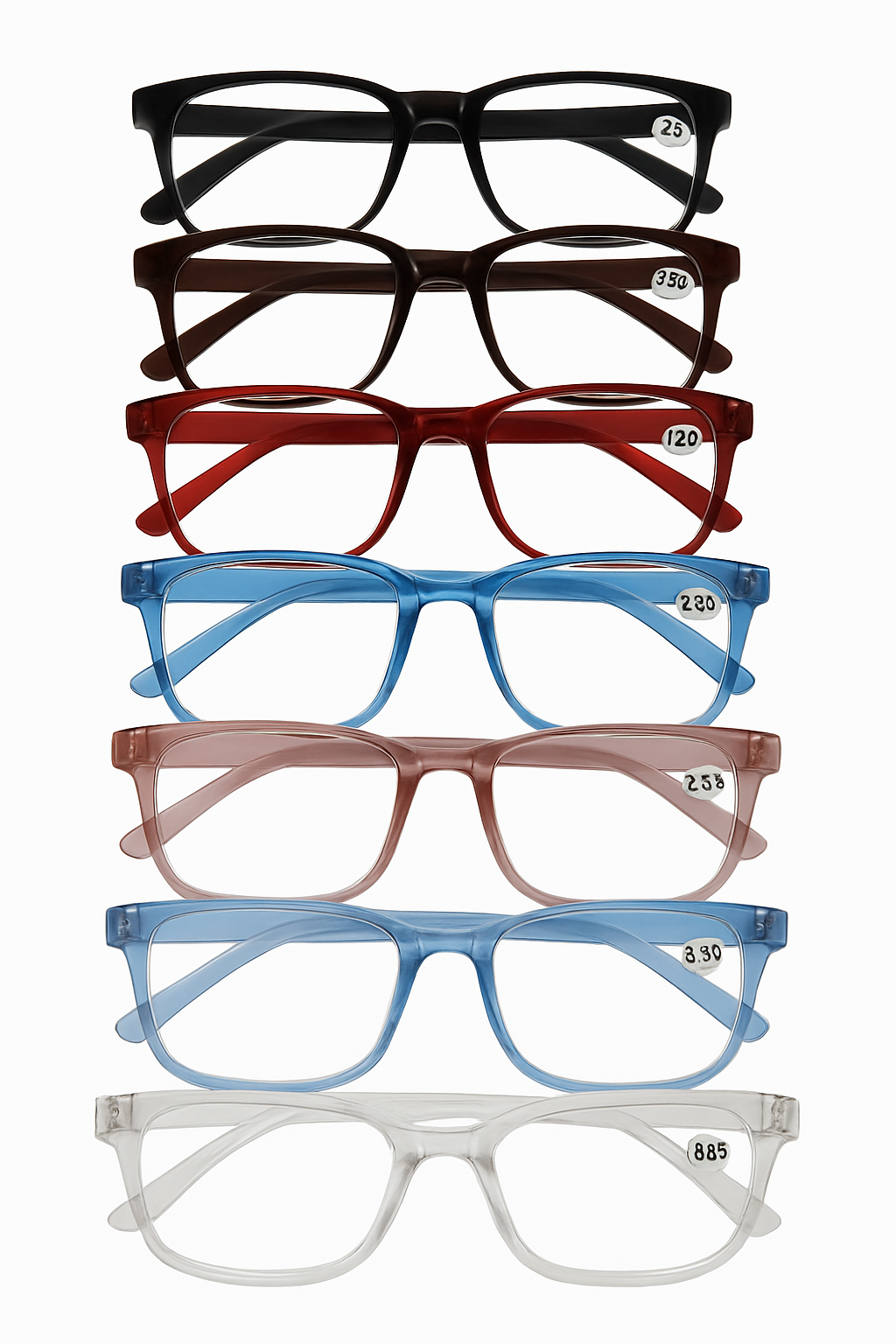Várias cores elegantes para combinar com o seu estilo: preto, marrom, vermelho, azul, rosa, transparente